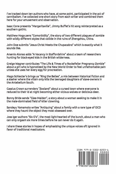 I've tracked down ten authors who have, at some point, participated in the act of cannibalism. I've collected one short story from each writer and combined them here for your amusement and observation. Isaac Cone presents "Margaritaville", Jimmy Buffet's hit song reinterpreted as a southern gothic. Sandeyu Yamamoto writes "Antiquing" about a family with a rare type of OCD where they haunt the object they most obsessed over. John Doe submits "Jesus Christ Meets the Chupacabra" which is exactly what it sounds like. Arsenio Alonso adds "A Vacancy in Staffordshire" about a team of researchers hunting for black-eyed kids in the British wilderness. Greige Wagner contributes "The Life & Times of a Rockefeller Pregnancy Zombie" about a girl who is hypnotized by the New World Order to feel unfathomable pain unless she uses her every egg for procreation. Mago Schlecter's brings us "Ring the Belles", a mix between historical fiction and a slasher where the villain only kills the teenaged daughters of slave-owners in the Antebellum South. Cassius Crown surrenders "Zooland" about a cursed town where everyone is reduced to their id at night becoming either vicious wolves or delicious deer. Bonny Bride sends "Glee-Maiden", a story about a woman seeking to make it in the male-dominated field of killer clowning. Matthew Hoga pens "Comorbidity", the story of two different plagues of zombie with wildly different styles that collide in the ruins of Zhengzhou, China. Joss Iger authors "Six O's", the most light-hearted of the bunch, about a man who can only orgasm six more times before he can never do it again. I share these stories in hopes of emphasizing the unique voices oft ignored in favor of traditional masticators.