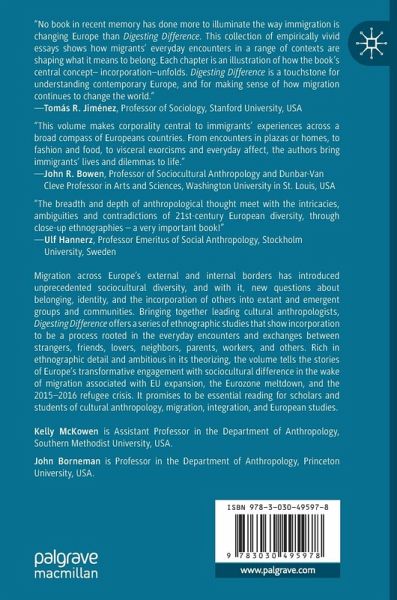 Migration across Europe's external and internal borders has introduced unprecedented sociocultural diversity, and with it, new questions about belonging, identity, and the incorporation of others into extant and emergent groups and communities. Bringing together leading cultural anthropologists, Digesting Difference offers a series of ethnographic studies that show incorporation to be a process rooted in the everyday encounters and exchanges between strangers, friends, lovers, neighbors, parents, workers, and others. Rich in ethnographic detail and ambitious in its theorizing, the volume tells the stories of Europe's transformative engagement with sociocultural difference in the wake of migration associated with EU expansion, the Eurozone meltdown, and the 2015-2016 refugee crisis. It promises to be essential reading for scholars and students of cultural anthropology, migration, integration, and European studies.