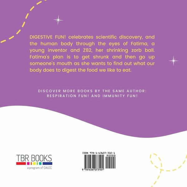 DIGESTIVE FUN! celebrates scientific discovery, and the human body through the eyes of Fatima, a young inventor and Z82, her shrinking zorb ball. Fatima's plan is to get shrunk and then go up someone's mouth as she wants to find out what our body does to digest the food we like to eat. Other books in the series include: Respiration Fun! and Immunity Fun!