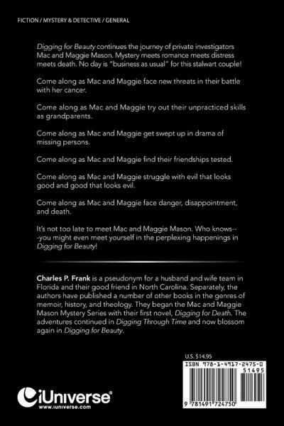 Digging for Beauty continues the journey of private investigators Mac and Maggie Mason. Mystery meets romance meets distress meets death. No day is "business as usual" for this stalwart couple! Come along as Mac and Maggie face new threats in their battle with her cancer. Come along as Mac and Maggie try out their unpracticed skills as grandparents. Come along as Mac and Maggie get swept up in drama of missing persons. Come along as Mac and Maggie find their friendships tested. Come along as Mac and Maggie struggle with evil that looks good and good that looks evil. Come along as Mac and Maggie face danger, disappointment, and death. It's not too late to meet Mac and Maggie Mason. Who knows---you might even meet yourself in the perplexing happenings in Digging for Beauty!
