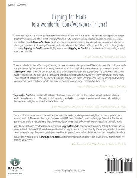 Digging for Goals is a wonderful book/workbook in one! "Mary does a great job of laying a foundation for what is needed in mind, body and spirit to develop your desires/dreams/intentions. And if that is not enough, Mary lays out 7 different approaches for developing those intentions into reality. I found Digging for Goals to be an effective process-oriented book to get you from where you are to where you want to be! Knowing Mary as a professional coach, her 'wholistic' flavor definitely shines through the process of Digging for Goals! I would highly recommend Digging for Goals if you are serious about moving toward your dreams in life. " - Shawn Preuss, PCC Professional Life Coach "There is little doubt that effective goal setting can make a tremendous positive difference in one's life, both personally and professionally. The problem for many people is that they simply don't know how to go about the process. In Digging For Goals, Mary lays out a clear and easy to follow path to effective goal setting. The book gets right to the heart of the matter and does so in a compelling and entertaining fashion. Having worked with Mary for many years, I have seen first-hand how she has helped scores of people lead more accomplished lives by setting and working towards their goals. This book can do the same for anyone looking to get more out of their lives." - William Aberman, Vice President Kesslers Diamonds "Digging for Goals is a must read for those who have never set goals for themselves as well as those who are sophisticated goal setters. The easy-to-follow guide clearly draws out a game plan that allows people to bring themselves to a higher level in all areas of their lives." - Scott Michel, Owner Orange Shoe Personal Fitness and Founder of 212 Fitness "Every bookstore has an enormous self-help section devoted to advising to lose weight, to be better parents, or to learn a new skill. There's no shortage of advice on WHAT to do. Yet the "knowing-doing gap" remains. The books gather dust, and the readers have the same unachieved goals they did when they purchased the self-help book. Mary Barnes Johnson has developed a workbook, Digging for Goals, spectacularly avoiding telling the reader WHAT to do. Instead, it tells us HOW to achieve whatever goal or goals we set. It's not preachy. It's not long-winded. It takes us step-by-step through the process, and gives real-life examples of overcoming obstacles any true change is sure to face. Regardless what our goal is, Digging for Goals can provide inspiration and methods to achieve it. Thanks, Mary, for helping us succeed." - Barb Kachelski, CAE, MBA, Association Executive Director www.diggingforgoals.com