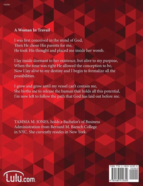 A Woman In Travail I was first conceived in the mind of God, Then He chose His parents for me, He took His thought and placed me inside her womb. I lay inside dormant to her existence, but alive to my purpose, When the time was right He allowed the conception to be, Now I lay alive to my destiny and I begin to formalize all the possibilities. I grow and grow until my vessel can't contain me, She births me to release the human that holds all this potential, I'm now left to follow the path that God has laid out before me. TAMMA M. JONES, holds a Bachelor's of Business Administration from Bernard M. Baruch College in NYC. She currently resides in New York.