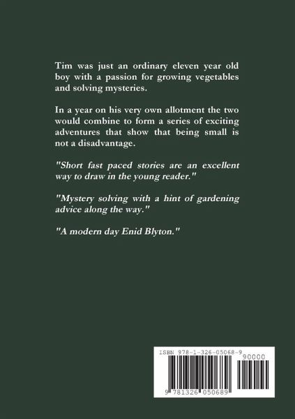 Tim was just an ordinary eleven year old boy with a passion for growing vegetables and solving mysteries. In a year on his very own allotment the two would combine to form a series of exciting adventures that show that being small is not a disadvantage. "Short fast paced stories are an excellent way to draw in the young reader." "Mystery solving with a hint of gardening advice along the way." "A modern day Enid Blyton."