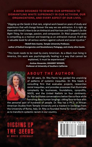 A book designed to rewire our approach to dismantling white supremacy in our activism, our organizations, and every aspect of our lives. Dr. Fierro takes the reader on an historical and sociological journey through the origins of our systems-when the intentions were set to endure centuries. The predictable fruits, like a tree planted from a seed, reveal hidden, encoded mechanisms. First Nations have denounced for centuries a crucial historical moment that birthed the segregation of all systems while remaining united under one banner of fear, lack, and punishment. With compelling clarity the author shines a light on the System (with a capital "S"), a composite of 10 single-systems that have been morphing together over centuries-without truly changing. Yet, we have the collective power to move this System that feeds on greed and entitlement from fear to freedom and from competition to peace. The author's personal transformation brings this theoretical knowledge into our lives, showing how each of us can be the catalyst for collective transformation, as well. For 20 years, Dr Rita Fierro has guided the unpicking of patterns of systemic inequities. Dr. Rita heads a consulting firm that evaluates projects, researches social inequities, and provides processes that illuminate complexity for businesses, foundations, nonprofits, NGOS, and the United Nations on four continents. Dr Rita facilitates conversations below the surface while honoring deep human longings: sitting face-to-face with the personal pain of hundreds of people. Dr. Rita has a Ph.D. in African American Studies from Temple University and a masters in Sociology from the University of Rome, Italy. Dr Rita co-founded Home for Good Coalition as to transform systemic racism in our country.