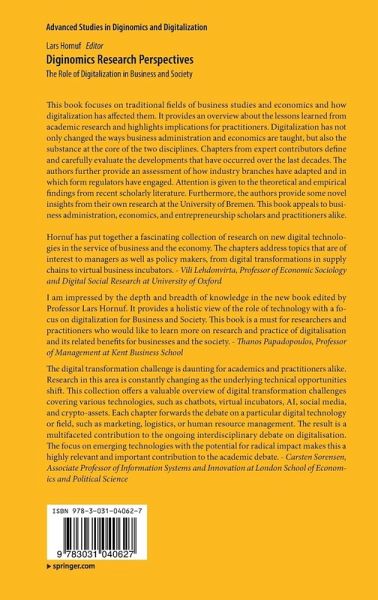 This book focuses on traditional fields of business studies and economics and how digitalization has affected them. It provides an overview about the lessons learned from academic research and highlights implications for practitioners. Digitalization has not only changed the ways business administration and economics are taught, but also the substance at the core of the two disciplines. Chapters from expert contributors define and carefully evaluate the developments that have occurred over the last decades. The authors further provide an assessment of how industry branches have adapted and in which form regulators have engaged. Attention is given to the theoretical and empirical findings from recent scholarly literature. Furthermore, the authors provide some novel insights from their own research at the University of Bremen. This book appeals to business administration, economics, and entrepreneurship scholars and practitioners alike.