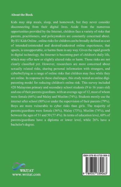 Kids may skip meals, sleep, and homework, but they never consider disconnecting from their digital lives. Aside from the numerous opportunities provided by the Internet, children face a variety of risks that parents, practitioners, and policymakers are constantly concerned about. By EU Kids Online , online risks for children can be broadly defined as a set of intended/unintended and desired/undesired online experiences, that upsets, is unsupportable, or harms them in any way. Given the rapid growth in digital technology, the Internet is becoming part of children's daily life, which may offer new or slightly altered risks or harm. Those risks are not clearly classified yet. However, researchers are more concerned about sexually related risks, sharing personal information with strangers, and cyberbullying as a range of online risks that children may face while they are online. In response to these challenges, this study tested an online digi-parenting model for reducing children's online risk. This survey included 420 Malaysian primary and secondary school students (9 to 16 years old) and one of their parents/guardians. with an average age of 12, most of whom were female (66%) and Malay and Muslim (74%). Students mostly use the internet after school (80%) or under the supervision of their parents (79%). Boys are more vulnerable to cyber risks than girls. The majority of parents/guardians were female (56%), Malay (73%), Muslim (74%), and between the ages of 31 and 50 (77.4%). In terms of education level, 60% of parents/guardians have a diploma or lower level, while 26% have a bachelor's degree.