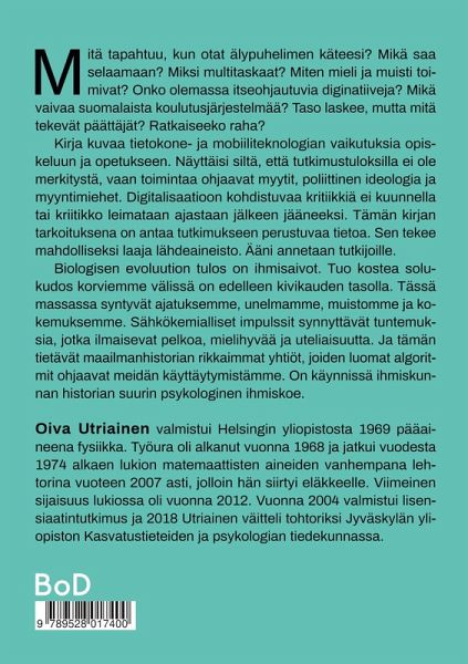 Mitä tapahtuu, kun otat älypuhelimen käteesi? Mikä saa selaamaan? Miksi multitaskaat? Miten mieli ja muisti toimivat? Onko olemassa itseohjautuvia diginatiiveja? Mikä vaivaa suomalaista koulutusjärjestelmää? Taso laskee, mutta mitä tekevät päättäjät? Ratkaiseeko raha? Kirja kuvaa tietokone- ja mobiiliteknologian vaikutuksia opiskeluun ja opetukseen. Näyttäisi siltä, että tutkimustuloksilla ei ole merkitystä, vaan toimintaa ohjaavat myytit, poliittinen ideologia ja myyntimiehet. Digitalisaatioon kohdistuvaa kritiikkiä ei kuunnella tai kriitikko leimataan ajastaan jälkeen jääneeksi. Tämän kirjan tarkoituksena on antaa tutkimukseen perustuvaa tietoa. Sen tekee mahdolliseksi laaja lähdeaineisto. Ääni annetaan tutkijoille. Biologisen evoluution tulos on ihmisaivot. Tuo kostea solukudos korviemme välissä on edelleen kivikauden tasolla. Tässä massassa syntyvät ajatuksemme, unelmamme, muistomme ja kokemuksemme. Sähkökemialliset impulssit synnyttävät tuntemuksia, jotka ilmaisevat pelkoa, mielihyvää ja uteliaisuutta. Ja tämän tietävät maailmanhistorian rikkaimmat yhtiöt, joiden luomat algoritmit ohjaavat meidän käyttäytymistämme. On käynnissä ihmiskunnan historian suurin psykologinen ihmiskoe.