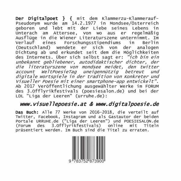 Alle 77 Werke von 2016-2018, die verteilt auf Twitter, Facebook, Instagram und als Gastautor der beiden Portale URRUHE.de ("Liga der Leeren") und POESIESALON.de (Forum des 3.Offlyrikfestivals) online mit Titeln präsentiert werden. Im Buch sind die Titel zu erraten.