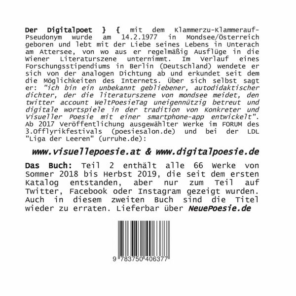 Teil 2 enthält alle 66 Werke von 2018-2019, die seit dem ersten Katalog entstanden, aber nur zum Teil auf Twitter, Facebook oder Instagram gezeigt wurden. Auch in diesem zweiten Buch sind die Titel wieder zu erraten. Lieferbar über NeuePoesie.de