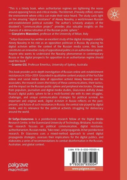 This book provides an in-depth investigation of Russian online anti-establishment resistances in 2016-2019. Grounded in qualitative content analysis of the YouTube videos and social media data of opposition activist Alexey Navalny and his associates, the research covers the history of these communications, their tactics, and the impact on the Russian public sphere and peripheral electorates. Drawing from populism, journalism and digital media studies, Glazunova skilfully shows Russia's digital public sphere to be a multi-faceted site with its own struggles, challenges, and unique communication strategies for political survival. An important and original work, Digital Activism in Russia reflects on the past, present, and future of such resistances in Russia, the central role played by digital media, and its relevance for the political activists struggling for democracy around the world.