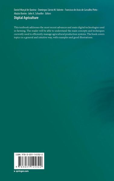 Chapter 1 - The Agriculture Eras.- Chapter 2 - Global Navigation Satellite Systems.- Chapter 3 - Spatial and Temporal Variability Analysis.- Chapter 4 - Images and Remote Sensing Applied to Agricultural Management.- Chapter 5 - Geoprocessing Applied to Crop Management.- Chapter 6 - Sampling and Interpretation of Maps.- Chapter 7 - Agricultural Drones' Application.- Chapter 8 - Sensors and Actuators.- Chapter 9 - Control and Automation Systems in Agricultural Machinery.- Chapter 10 - Digital Irrigation.- Chapter 11 - Digital Livestock Farming.- Chapter 12 - Internet of Things In Agriculture.- Chapter 13 - Data transmission, cloud computing and Big Data.- Chapter 14 - Machine Learning.- Chapter 15 - Platforms, Applications and Software.- Chapter 16 - Digital Data: Cycle, Standardization, Quality, Sharing and Security.- Chapter 17 - Case Study: SLC Agrícola.- Index.