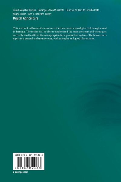 Chapter 1 - The Agriculture Eras.- Chapter 2 - Global Navigation Satellite Systems.- Chapter 3 - Spatial and Temporal Variability Analysis.- Chapter 4 - Images and Remote Sensing Applied to Agricultural Management.- Chapter 5 - Geoprocessing Applied to Crop Management.- Chapter 6 - Sampling and Interpretation of Maps.- Chapter 7 - Agricultural Drones' Application.- Chapter 8 - Sensors and Actuators.- Chapter 9 - Control and Automation Systems in Agricultural Machinery.- Chapter 10 - Digital Irrigation.- Chapter 11 - Digital Livestock Farming.- Chapter 12 - Internet of Things In Agriculture.- Chapter 13 - Data transmission, cloud computing and Big Data.- Chapter 14 - Machine Learning.- Chapter 15 - Platforms, Applications and Software.- Chapter 16 - Digital Data: Cycle, Standardization, Quality, Sharing and Security.- Chapter 17 - Case Study: SLC Agrícola.- Index.