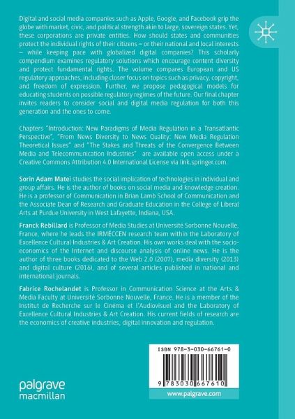 Digital and social media companies such as Apple, Google, and Facebook grip the globe with market, civic, and political strength akin to large, sovereign states. Yet, these corporations are private entities. How should states and communities protect the individual rights of their citizens - or their national and local interests - while keeping pace with globalized digital companies? This scholarly compendium examines regulatory solutions which encourage content diversity and protect fundamental rights. The volume compares European and US regulatory approaches, including closer focus on topics such as privacy, copyright, and freedom of expression. Further, we propose pedagogical models for educating students on possible regulatory regimes of the future. Our final chapter invites readers to consider social and digital media regulation for both this generation and the ones to come.