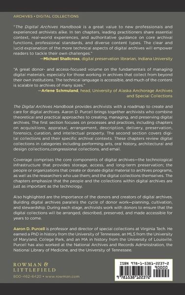 Introduction, by Aaron D. Purcell Part I: Processes and Practices Chapter 1: Acquisitions, Appraisal, and Arrangement Lisa Calahan Chapter 2: Description and Delivery Dorothy Waugh Chapter 3: Digital Preservation Bertram Lyons Chapter 4: Digital Forensics and Curation Martin Gengenbach Chapter 5: Contracts, Intellectual Property, and Privacy Heather Briston Part II: Collections and Environments Chapter 6: Performing Arts Collections Vincent J. Novara Chapter 7: Oral History Collections Douglas A. Boyd Chapter 8: Architectural and Design Collections Aliza Leventhal Chapter 9: Congressional Collections Danielle Emerling Chapter 10: Email Matthew Farrell