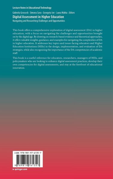 This book offers a comprehensive exploration of digital assessment (DA) in higher education, with a focus on navigating the challenges and opportunities brought on by the digital age. By drawing on research-based evidence and theoretical approaches, it offers valuable insights, guidance, and examples for navigating the complexities of DA in higher education. It addresses key topics and issues facing educators and Higher Education Institutions (HEIs) in the design, implementation, and evaluation of DA strategies, while also recognizing the importance of the DA competencies of academic staff.