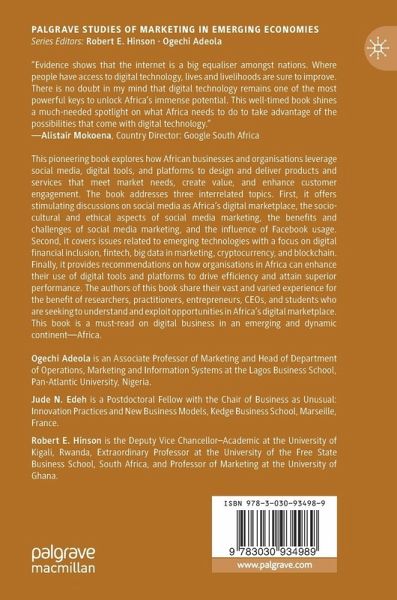 1. Digital Business in Africa: Social Media and Related Technologies - An Introduction.- 2. Ethical Social Media Marketing in Africa.- 3. The Benefits and Challenges of Social Media Marketing: Experience from Small and Rural-Based Entrepreneurs in the Vhembe District of Limpopo Province, South Africa.- 4. Influence of Facebook Usage on Organisational Performance in Ghana: The Pivotal Role of Social Capital and Salesperson Extra-Role Behaviour.- 5. Examining the Impact of Value-Driven Social Media Content Strategies and Product Type on Social Media Behavioural Engagement: Evidence from Nigeria.- 6. A Self-Concept Interactionist Model of Social Media Reputation.- 7. Africa's Digital Marketplace: The Role of Social Media in Customer Engagement.- 8. Digital Financial Inclusion: M-PESA in Kenya.- 9. Fintech, Cryptocurrency and Blockchain Technology: Towards Promoting a Digital Africa.- 10. Role, Characteristics and Critical Success Factors of Big Data(BD) - Implications for Marketing in Africa.- 11. Driving Business Performance through Customer Value Management Practice: A Case of Digital Tag Channel in an Emerging Mobile Market.- 12. Fostering a Digital Learning Ecosystem in Nigeria.- 13. Digital Tools and Platforms as the New Market Place: Driving Digital Business in Africa.