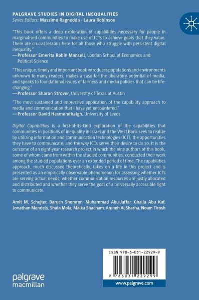 Digital Capabilities is a first-of-its-kind exploration of the capabilities that communities in positions of inequality in Israel and the West Bank seek to realize by utilizing information and communication technologies (ICT), the opportunities they have to communicate, and the way ICTs serve their desire to do so. It is the outcome of an eight-year research project in which the nine authors of this book, some of whom came from within the studied communities, conducted their work among the studied populations over an extended period of time. The capabilities approach, much discussed theoretically, takes on a life in this project and is presented as an empirically observable phenomenon for assessing whether ICTs are serving actual needs, whether communication resources are justly allocated and distributed and whether they serve the goal of a universally accessible right to communicate.