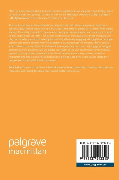 This book describes and understands the many factors that influence a person's behavior towards digital technologies, and how that affects the person's potential to benefit from digital society. The ability to adapt to these new technological environments - and the extent to which an individual embraces them - has become critical to an individual's well-being and quality of life, the underlying assumption being that only by effectively engaging with digital technologies can the user accrue benefits from the experience. By introducing the concept "digital capital," which refers to the conditions that determine how people access, use, and engage with digital technology, Park examines how the digital ecosystem of the user lead to new forms of digital inequality. Using numerous empirical studies on internet users and non-users, as well as recommending small localized solutions to the big global problem, a critical and alternative perspective of the digital divide is provided.