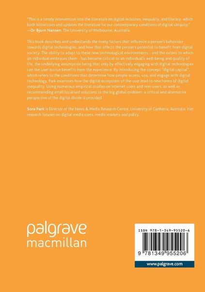 This book describes and understands the many factors that influence a person's behavior towards digital technologies, and how that affects the person's potential to benefit from digital society. The ability to adapt to these new technological environments - and the extent to which an individual embraces them - has become critical to an individual's well-being and quality of life, the underlying assumption being that only by effectively engaging with digital technologies can the user accrue benefits from the experience. By introducing the concept "digital capital," which refers to the conditions that determine how people access, use, and engage with digital technology, Park examines how the digital ecosystem of the user lead to new forms of digital inequality. Using numerous empirical studies on internet users and non-users, as well as recommending small localized solutions to the big global problem, a critical and alternative perspective of the digital divide is provided.