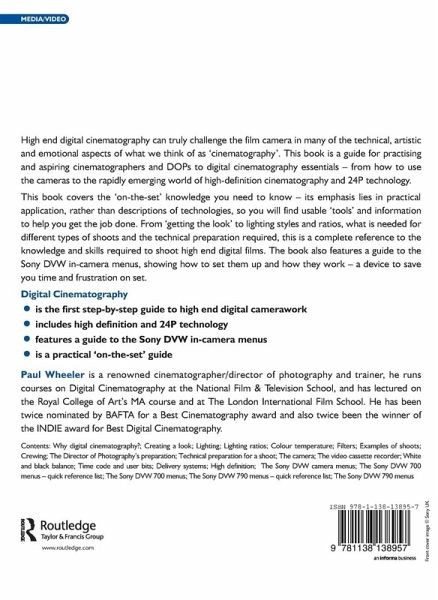 High end digital cinematography can truly challenge the film camera in many of the technical, artistic and emotional aspects of what we think of as 'cinematography'. This book is a guide for practising and aspiring cinematographers and DOPs to digital cinematography essentials - from how to use the cameras to the rapidly emerging world of High Definition cinematography and 24p technology. This book covers the `on-the-set' knowledge you need to know - its emphasis lies in practical application, rather than descriptions of technologies, so that in this book you will find usable `tools' and information to help you get the job done. From `getting the look' to lighting styles and ratios, what is needed for different types of shoots and the technical preparation required, this is a complete reference to the knowledge and skills required to shoot high end digital films. The book also features a guide to the Sony DVW in-camera menus - showing how to set them up and how they work - adevice to save you time and frustration on set. Paul Wheeler is a renowned cinematographer/director of photography and trainer, he runs courses on Digital Cinematography at the National Film & Television School and has lectured on the Royal College of Art's MA course and at The London International Film School. He has been twice nominated by BAFTA for a Best Cinematography award and also twice been the winner of the INDIE award for Best Digital Cinematography.