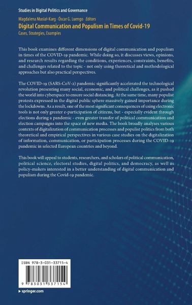 This book examines different dimensions of digital communication and populism in times of the COVID-19 pandemic. While doing so, it discusses views, opinions, and research results regarding the conditions, experiences, constraints, benefits, and challenges related to the topic - not only using theoretical and methodological approaches but also practical perspectives. The COVID-19 (SARS-CoV-2) pandemic significantly accelerated the technological revolution presenting many social, economic, and political challenges, as it pushed the world into cyberspace to ensure social distancing. At the same time, many populist protests expressed in the digital public sphere massively gained importance during the lockdowns. As a result, one of the most significant consequences of using electronic tools is not only greater e-participation of citizens, but - especially evident through elections during a pandemic - even greater transfer of political communication and election campaigns into the space of new media. The book broadly analyses various contexts of digitalization of communication processes and populist politics from both theoretical and empirical perspectives in various case studies on the digitalization of information, communication, or participation processes during the COVID-19 pandemic in selected European countries and beyond. This book will appeal to students, researchers, and scholars of political communication, political science, electoral studies, digital politics, and democracy, as well as policy-makers interested in a better understanding of digital communication and populism during the Covid-19 pandemic.