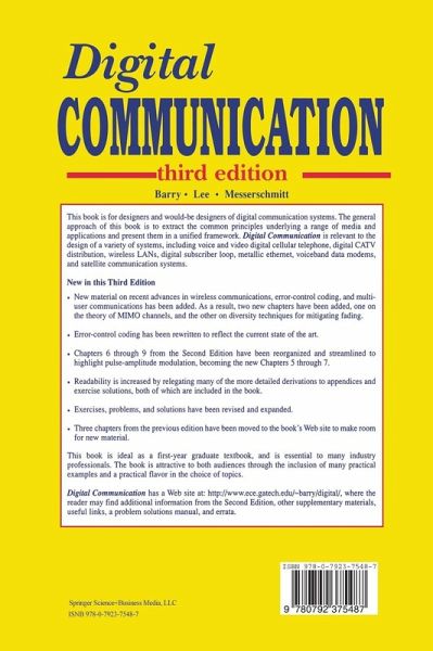 This book concerns digital communication. Specifically, we treat the transport of bit streams from one geographical location to another over various physical media, such as wire pairs, coaxial cable, optical fiber, and radio. We also treat multiple-access channels, where there are potentially multiple transmitters and receivers sharing a common medium. Ten years have elapsed since the Second Edition, and there have been remarkable advances in wireless communication, including cellular telephony and wireless local-area networks. This Third Edition expands treatment of communication theories underlying wireless, and especially advanced techniques involving multiple antennas, which tum the traditional single-input single-output channel into a multiple-input multiple-output (MIMO) channel. This is more than a trivial advance, as it stimulates many advanced techniques such as adaptive antennas and coding techniques that take advantage of space as well as time. This is reflected in theaddition of two new chapters, one on the theory of MIMO channels, and the other on diversity techniques for mitigating fading. The field of error-control coding has similarly undergone tremendous changes in the past decade, brought on by the invention of turbo codes in 1993 and the subsequent rediscovery of Gallager's low-density parity-check codes. Our treatment of error-control coding has been rewritten to reflect the current state of the art. Other materials have been reorganized and reworked, and three chapters from the previous edition have been moved to the book's Web site to make room.