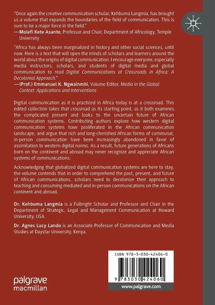 1. Seshu nu per ankh: The Ancient Kemetian Genesis of Digital Communication - Abdul Karim Bangura.- 2. Digital Communications: Colonization or Rationalization? - Chuka Onwumechili and Shamilla Amulega.- 3. Digital Communication in Africa at Crossroads: From Physical Exploitation in the Past to Virtual Dominance Now - M'Bawine Atintande.- 4. Africa at Development Policy and Practice Crossroads in the Digital Era: Navigating Decolonization and Glocalization - Bala A. Musa.- 5. Pax-Africana versus Western Digi-Culturalism: An Ethnomethodological Study of Selected Mobile African Apps - Kehbuma Langmia.- 6. Africans and Digital Communication at Crossroads: Rethinking Existing Decolonial Paradigms - Agnes Lucy Lando.- 7. African Communication Paradigms between Yesterday and Tomorrow: Preserving and Enhancing Africanity in the Digital Age - Mohammed Saliou Camara.- 8. Digital Communication Tools in the Classroom as a Decolonial Solution: Pedagogical Experiments from Ashesi University in Ghana - Kajsa Hallberg Adu.