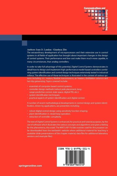 The extraordinary development of digital computers (microprocessors, microcontrollers) and their extensive use in control systems in all fields of applications has brought about important changes in the design of control systems. Their performance and their low cost make them suitable for use in control systems of various kinds which demand far better capabilities and performances than those provided by analog controllers. However, in order really to take advantage of the capabilities of microprocessors, it is not enough to reproduce the behavior of analog (PID) controllers. One needs to implement specific and high-performance model based control techniques developed for computer-controlled systems (techniques that have been extensively tested in practice). In this context identification of a plant dynamic model from data is a fundamental step in the design of the control system. The book takes into account the fact that the association of books with software and on-line materialis radically changing the teaching methods of the control discipline. Despite its interactive character, computer-aided control design software requires the understanding of a number of concepts in order to be used efficiently. The use of software for illustrating the various concepts and algorithms helps understanding and rapidly gives a feeling of the various phenomena.