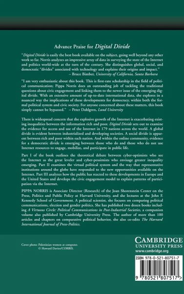 There is widespread concern that the growth of the Internet is exacerbating inequalities between the information rich and poor. Digital Divide examines access and use of the Internet in 179 nations world-wide. A global divide is evident between industrialized and developing societies. A social divide is apparent between rich and poor within each nation. Within the online community, evidence for a democratic divide is emerging between those who do and do not use Internet resources to engage and participate in public life. Part I outlines the theoretical debate between cyber-optimists who see the Internet as the great leveler. Part II examines the virtual political system and the way that representative institutions have responded to new opportunities on the Internet. Part III analyzes how the public has responded to these opportunities in Europe and the United States and develops the civic engagement model to explain patterns of participation via the Internet.
