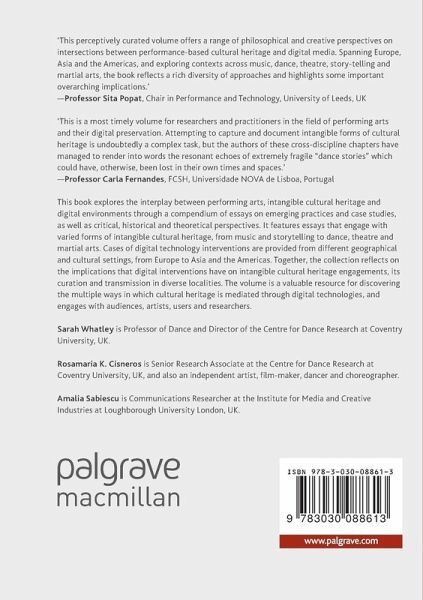 This book explores the interplay between performing arts, intangible cultural heritage and digital environments through a compendium of essays on emerging practices and case studies, as well as critical, historical and theoretical perspectives. It features essays that engage with varied forms of intangible cultural heritage, from music and storytelling to dance, theatre and martial arts. Cases of digital technology interventions are provided from different geographical and cultural settings, from Europe to Asia and the Americas. Together, the collection reflects on the implications that digital interventions have on intangible cultural heritage engagements, its curation and transmission in diverse localities. The volume is a valuable resource for discovering the multiple ways in which cultural heritage is mediated through digital technologies, and engages with audiences, artists, users and researchers.