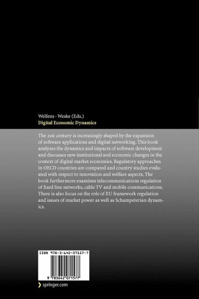 The 21st century is increasingly shaped by the expansion of software applications and digital networking. This book analyzes the dynamics and impacts of software development and discusses new institutional and economic changes in the context of digital market economies. Regulatory approaches in OECD countries are compared and country studies evaluated with respect to innovation and welfare aspects. The book furthermore examines telecommunications regulation of fixed line networks, cable TV and mobile communications. There is also focus on the role of EU framework regulation and issues of market power as well as Schumpeterian dynamics.