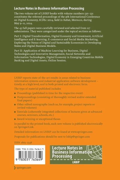 Digital Transformation.- Advancements and Challenges in AI Applications for B2C Retail Promotions Unveiling a Socio Technical Framework for Computer Vision Technologies and Generative Adversarial Networks.- Unravelling the adoption of digital technologies by European SMEs.- Successful Digital Transformation Observations on Digital Maturity, Technology and Logistics in Multiple Industries.- Digital Economy and Investment.- Defining Digital Platforms A Systematic Literature Review.- Digital Economy and Digital Maturity A Comprehensive Review.- Digital investment and firm performance evidence from Moroccan companies.- The nature of the relationship between Digital Financial Inclusion Index and China's Regional Economic Growth GMM-system empirical evidence.- Artificial Intelligence and E-learning.- Potential of Artificial Intelligence in Education A Practical Case Study at Mohammed V University Rabat.- Construction of Knowledge with Strategies Enabled by Generative Artificial Intelligence.- Students' Perceptions of Barriers in Four Teaching Formats a Quantitative Study.- Investigating the Higher Student's Acceptance of E Learning in Universities An Application of UTAUT Model.- E-commerce and Social Media Marketing.- Content and Review Platform Engagement of End Users and Local Businesses an Explorative Analysis based on Google Maps Data.- The effect of product innovativeness on online consumer engagement through the mediating role of intrinsic motivation and ewom.- Does Religiosity Matter An Indonesian Experience in Building Awareness and Developing Sharia E Commerce.- Unlocking Success in Social Media Across the Customer Journey An Integrated Marketing Communication Perspective.- Exploring the Nexus of Digital and Sustainable Economies in Developing States.- Digitalization and Shadow Economy A Literature Review.- The impact of Green Innovation on Green Growth in the era of digitalization Evidence from EU countries.- Is there a relationship between shadow economy, digitalization, and sustainable development Insights from a national and regional bibliometric analysis.- Digital Business Models.- Exploring Customer Acceptance of Smart Stores An Advanced Model Approach.- Bibliometric analysis and network mapping on Mobile Technologies in the area of marketing: Emerging topics and research agenda.- Catalysts driving the integration of artificial intelligence (AI) in project management an in depth exploration with a focus on the Moroccan context.- Integrating Advanced Mobility Services in Federated Data Spaces An Exploration of Organizational Roles.