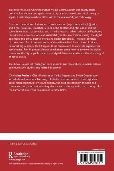 This fifth volume in Christian Fuchs's Media, Communication and Society series presents foundations and applications of digital ethics based on critical theory. It applies a critical approach to ethics within the realm of digital technology.