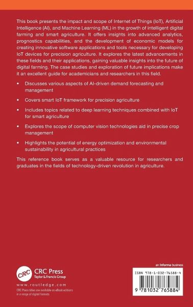 This book presents the impact and scope of Internet of Things (IoT), Artificial Intelligence (AI), and Machine Learning (ML) in the growth of intelligent digital farming and smart agriculture. It offers insights into advanced analytics, prognostics capabilities, and the development of economic models for creating innovative software applications and tools necessary for developing IoT devices for precision agriculture. It explores the latest advancements in these fields and their applications, gaining valuable insights into the future of digital farming. The case studies and exploration of future implications make it an excellent guide for academicians and researchers in this field. Discusses various aspects of AI-driven demand forecasting and managementCovers smart IoT framework for precision agricultureIncludes topics related to deep learning techniques combined with IoT for smart agricultureExplores the scope of computer vision technologies aid in precise crop managementHighlights the potential of energy optimization and environmental sustain- ability in agricultural practices This reference book serves as a valuable resource for researchers and graduates in the fields of t chnology-driven revolution in agriculture.