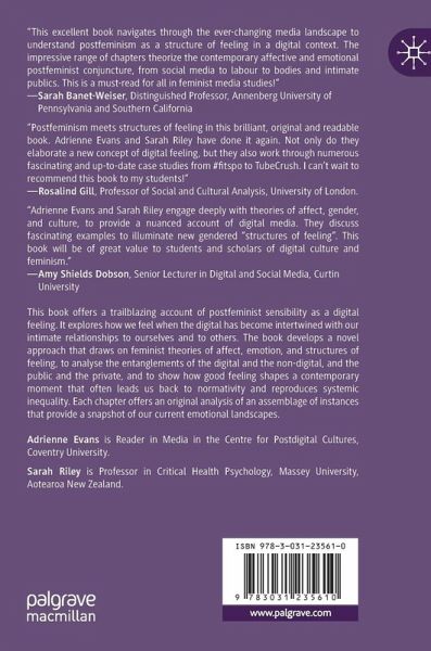This book offers a trailblazing account of postfeminist sensibility as a digital feeling that shapes how we understand the world around us. It explores how we feel in a world where the digital has become intertwined with our intimate relationships to ourselves and to others. The book develops a novel approach that draws on feminist theories of affect, emotion, and structures of feeling, to analyse the entanglements of the digital and the non-digital, and the public and the private, and to show how good feeling shapes a contemporary moment that often leads us back to normativity and reproduces systemic inequality. This is achieved through several different digital media spheres, including: the Instagram account Barbie Savior, #fitspo content, TikTok influencers and their Get Ready With Me videos, the archive of hot men on TubeCrush, and the intimacies of the internet cat, suggesting that each offers a snapshot of our current emotional landscapes.