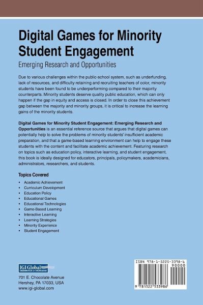 Due to various challenges within the public-school system, such as underfunding, lack of resources, and difficulty retaining and recruiting teachers of color, minority students have been found to be underperforming compared to their majority counterparts. Minority students deserve quality public education, which can only happen if the gap in equity and access is closed. In order to close this achievement gap between the majority and minority groups, it is critical to increase the learning gains of the minority students. Digital Games for Minority Student Engagement: Emerging Research and Opportunities is an essential reference source that argues that digital games can potentially help to solve the problems of minority students' insufficient academic preparation, and that a game-based learning environment can help to engage these students with the content and facilitate academic achievement. Featuring research on topics such as education policy, interactive learning, and student engagement, this book is ideally designed for educators, principals, policymakers, academicians, administrators, researchers, and students.