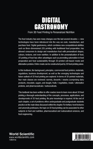 The food industry has seen many changes over the last several decades - new technologies have been introduced into the way we cook, manufacture, and present food products to consumers. Digital gastronomy, which combines new computational abilities such as three-dimensional (3D) printing with traditional food preparation, has allowed consumers to design and manufacture food with personalized shapes, colours, textures, and even nutrition. In addition to the personalization of food, 3D printing of food has other advantages such as promoting automation in food preparation and food sustainability through 3D-printed cell-based meats and alternative proteins. Entire meals can be constructed just by 3D food printing alone. In this textbook, the background, principles, commercial food printers, materials, regulations, business development, as well as the emerging technologies and future outlook of 3D food printing are explored. In terms of 3D-printed materials, four main classes are reviewed: namely, desserts / snacks (comprising dairy products, chocolate, sugars, and dough), fruits / vegetables, meats /alternative proteins, and pharmaceuticals / nutraceuticals. This textbook has been written to offer readers keen to learn more about 3D food printing in terms of concepts, processes, applications, and developments of 3D food printing. No prior knowledge is required. At the end of each chapter, a set of problems offers undergraduate and postgraduate students practice on the main ideas discussed within the chapter. For tertiary-level lecturers and university professors, the topic on 3D food printing can be associated to other subjects in food and nutrition, pharmaceutical and nutraceutical sciences, and food engineering.