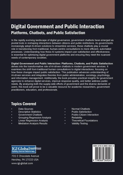 In the rapidly evolving landscape of digital governance, government chatbots have emerged as pivotal tools in reshaping interactions between citizens and public institutions. As governments increasingly adopt AI-driven solutions to streamline services, these chatbots play a crucial role in transitioning from traditional, human-centric consultations to more efficient, automated processes. Understanding how these AI systems impact user satisfaction and effectiveness is essential for optimizing digital government platforms and ensuring they meet the nuanced needs of contemporary societies. Digital Government and Public Interaction: Platforms, Chatbots, and Public Satisfaction delves into the transformative role of AI-driven chatbots in modern government services. It examines the shift from traditional human consultations to digital interactions, focusing on how these changes impact public satisfaction. This publication advances understanding of AI-driven services and integrates theories from public administration, sociology, psychology, and information management. Additionally, the book provides practical insights for government agencies to enhance digital services, improve response quality, and better address public needs. By analyzing both the supply-side efforts of government and the diverse demands of users, this book will prove to be a valuable resource for academic researchers, government practitioners, educators, and professionals.