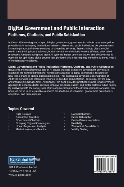 In the rapidly evolving landscape of digital governance, government chatbots have emerged as pivotal tools in reshaping interactions between citizens and public institutions. As governments increasingly adopt AI-driven solutions to streamline services, these chatbots play a crucial role in transitioning from traditional, human-centric consultations to more efficient, automated processes. Understanding how these AI systems impact user satisfaction and effectiveness is essential for optimizing digital government platforms and ensuring they meet the nuanced needs of contemporary societies. Digital Government and Public Interaction: Platforms, Chatbots, and Public Satisfaction delves into the transformative role of AI-driven chatbots in modern government services. It examines the shift from traditional human consultations to digital interactions, focusing on how these changes impact public satisfaction. This publication advances understanding of AI-driven services and integrates theories from public administration, sociology, psychology, and information management. Additionally, the book provides practical insights for government agencies to enhance digital services, improve response quality, and better address public needs. By analyzing both the supply-side efforts of government and the diverse demands of users, this book will prove to be a valuable resource for academic researchers, government practitioners, educators, and professionals.