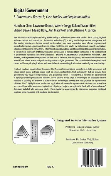 New information technologies are being applied swiftly to all levels of government service: local, county, regional and even national and international. Information technology (IT) is being used to improve data management and data sharing, planning and decision support, service delivery, and more. Application areas affected by government mandates to improve e-government service include healthcare and safety; law enforcement, security, and justice; education; land use; and many others. DIGITAL GOVERNMENT: E-Government Research, Case Studies, and Implementation provides the field with a definitive, interdisciplinary, and understandable review of recent IT and related research of particular importance to digital government. The book also includes explorations of current and future policy implications, and case studies of successful applications in a variety of government settings.