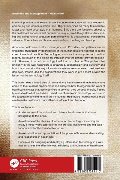 Medical practice and research are inconceivable today without electronic computing and communication tools. Digital machines do many tasks orders-of-magnitude better, faster and more accurately than humans. Still, there are functions critical to the healthcare endeavor that people do much better than machines, things like: understanding and using natural language; perceiving what is unexpressed; taking into account values, culture, ethics, and human relationships; touching and healing. For the foreseeable future, the "smartest" computers will be no match for human beings when it comes to performing these most anthropic functions. American healthcare is at a critical juncture. Providers and patients are increasingly frustrated by degradation of the human relationships that lie at the core of the medical practice. Technologies, such as the computerized medical record, get much of the blame for intrusion into the patient-provider relationship. However, it is not technology itself that is to blame. The fault lies with how systems are conceived, designed, and deployed. This book analyzes how to organize the work of healthcare in a way that uses machines to do what they do best, thereby freeing humans to do what we do best. Smart use of electronic technology is crucial to the success of any bid to fulfill the Institute for Healthcare Improvement's triple aim to make healthcare more effective, efficient, and humane.