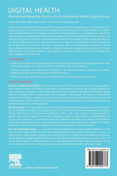 1. Introduction to digital health approach and mHealth applications for participatory health Mohy Uddin, MD and Shabbir Syed-Abdul, MD, MSc, PhD 2. Digital health in the era of personalized healthcare: opportunities and challenges for bringing research and patient care to a new level Jorge Cancela, PhD, Iliàs Charlafti, MSc, Seya Colloud, PharmD and Catherine Wu, MSc 3. Wearables, smartphones, and artificial intelligence for digital phenotyping and health Ignacio Perez-Pozuelo, MSc, MS, Dimitris Spathis, Msc, Emma A.D. Clifton, PhD and Cecilia Mascolo, PhD 4. Artificial intelligence/machine learning solutions for mobile and wearable devices Zhenxing Xu, PhD, Bin Yu, PhD and Fei Wang, PhD 5. mHealth for research: participatory research applications to gain disease insights Ipek Ensari, PhD and Noémie Elhadad, PhD 6. Mobile health apps: the quest from laboratory to the market Juan José Lull, PhD, Antonio Martínez-Millana, PhD and Vicente Traver, PhD 7. mHealth in public health sector: challenges and opportunities in low- and middle-income countries: a case study of Sri Lanka Pamod Amarakoon, MBBS, Roshan Hewapathirana, MBBS, MSc, PhD and Vajira H.W. Dissanayake, MBBS, PhD 8. How to use the Integrated-Change Model to design digital health programs Kei Long Cheung, PhD, Santiago Hors-Fraile, PhD and Hein de Vries, PhD 9. Illustration of tailored digital health and potential new avenues Kei Long Cheung, PhD, Santiago Hors-Fraile, PhD and Hein de Vries, PhD 10. Sustainability of mHealth solutions for healthcare system strengthening Mohamed-Amine Choukou, PhD 11. Digital health regulatory and policy considerations Robert Jarrin, JD and Kapil Parakh, MD, MPH, PhD