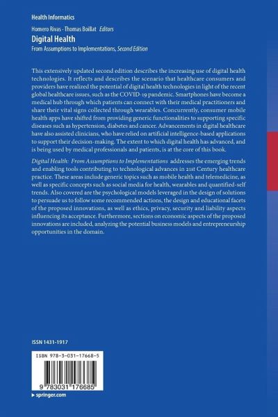 Digital Health: From Assumptions toImplementations addresses the emerging trends and enabling tools contributing to technological advances in 21st Century healthcare practice. These areas include generic topics such as mobile health and telemedicine, as well as specific concepts such as social media for health, wearables and quantified-self trends. Also covered are the psychological models leveraged in the design of solutions to persuade us to follow some recommended actions, the design and educational facets of the proposed innovations, as well as ethics, privacy, security and liability aspects influencing its acceptance. Furthermore, sections on economic aspects of the proposed innovations are included, analyzing the potential business models and entrepreneurship opportunities in the domain.