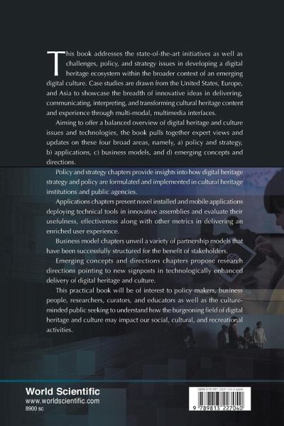 This book addresses the state-of-the-art initiatives as well as challenges, policy, and strategy issues in developing a digital heritage ecosystem within the broader context of an emerging digital culture. Case studies are drawn from the United States, Europe, and Asia to showcase the breadth of innovative ideas in delivering, communicating, interpreting, and transforming cultural heritage content and experience through multi-modal, multimedia interfaces. Aiming to offer a balanced overview of digital heritage and culture issues and technologies, the book pulls together expert views and updates on these four broad areas, namely, a) policy and strategy, b) applications, c) business models, and d) emerging concepts and directions. Policy and strategy chapters provide insights into how digital heritage strategy and policy are formulated and implemented in cultural heritage institutions and public agencies. Applications chapters present novel installed and mobile applications deploying technical tools in innovative assemblies and evaluate their usefulness, effectiveness along with other metrics in delivering an enriched user experience. Business model chapters unveil a variety of partnership models that have been successfully structured for the benefit of stakeholders. Emerging concepts and directions chapters propose research directions pointing to new signposts in technologically enhanced delivery of digital heritage and culture. This practical book will be of interest to policy makers, business people, researchers, curators, and educators as well as the culture-minded public seeking to understand how the burgeoning field of digital heritage and culture may impact our social, cultural, and recreational activities.