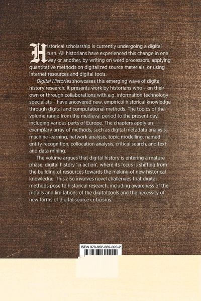 Historical scholarship is currently undergoing a digital turn. All historians have experienced this change in one way or another, by writing on word processors, applying quantitative methods on digitalized source materials, or using internet resources and digital tools. Digital Histories showcases this emerging wave of digital history research. It presents work by historians who - on their own or through collaborations with e.g. information technology specialists - have uncovered new, empirical historical knowledge through digital and computational methods. The topics of the volume range from the medieval period to the present day, including various parts of Europe. The chapters apply an exemplary array of methods, such as digital metadata analysis, machine learning, network analysis, topic modelling, named entity recognition, collocation analysis, critical search, and text and data mining. The volume argues that digital history is entering a mature phase, digital history 'in action', where its focus is shifting from the building of resources towards the making of new historical knowledge. This also involves novel challenges that digital methods pose to historical research, including awareness of the pitfalls and limitations of the digital tools and the necessity of new forms of digital source criticisms. Through its combination of empirical, conceptual and contextual studies, Digital Histories is a timely and pioneering contribution taking stock of how digital research currently advances historical scholarship.