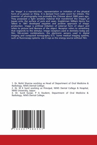 An 'image' is a reproduction, representation or imitation of the physical form of a person or thing. It is derived from Latin word for imitate. The inventor of photography was probably the Chinese about 3000 years ago. They possessed a light sensitive material that transferred the images of leaves onto the surface of pots and vases. Englishman William Henry Fox Talbot in 1841 developed negative and positive approach of image production. Image is artificial imitation of external form of object and refers to picture and likeness of the object. Receptor refers to something that responds to the stimulus. Image receptors used in dentistry today are film, film-screen combinations, the electronic sensors used in digital imaging and computed tomography (CT). Some medical imaging systems, such as fluoroscopy systems, use X-rays as the energy source without film.