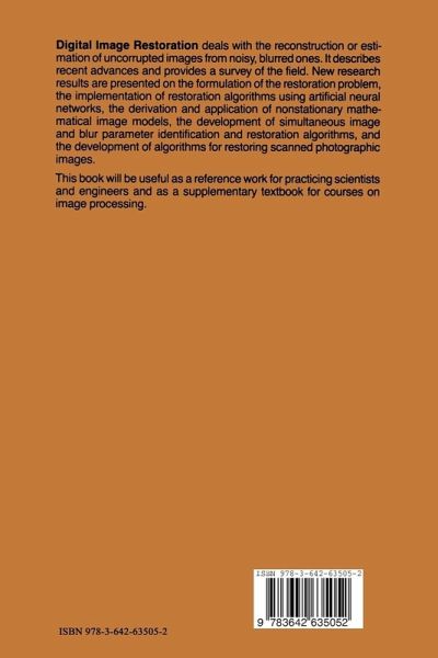 The field of image restoration is concerned with the estimation of uncorrupted im ages from noisy, blurred ones. These blurs might be caused by optical distortions, object motion during imaging, or atmospheric turbulence. In many scientific and en gineering applications, such as aerial imaging, remote sensing, electron microscopy, and medical imaging, there is active or potential work in image restoration. The purpose of this book is to provide in-depth treatment of some recent ad vances in the field of image restoration. A survey of the field is provided in the introduction. Recent research results are presented, regarding the formulation of the restoration problem as a convex programming problem, the implementation of restoration algorithms using artificial neural networks, the derivation of non stationary image models (compound random fields) and their application to image estimation and restoration, the development of algorithms for the simultaneous image and blur parameter identification and restoration, and the development of algorithms for restoring scanned photographic images. Special attention is directed to issues of numerical implementation. A large number of pictures demonstrate the performance of the restoration approaches. This book provides a clear understanding of the past achievements, a detailed description of the very important recent developments and the limitations of existing approaches, in the rapidly growing field of image restoration. It will be useful both as a reference book for working scientists and engineers and as a supplementary textbook in courses on image processing.