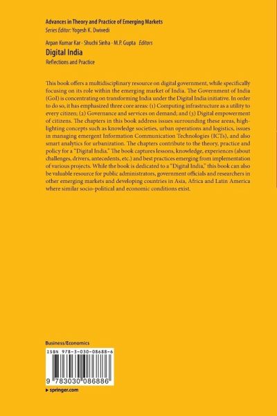 This book offers a multidisciplinary resource on digital government, while specifically focusing on its role within the emerging market of India. The Government of India (GoI) is concentrating on transforming India under the Digital India initiative. In order to do so, it has emphasized three core areas: (1) Computing infrastructure as a utility to every citizen; (2) Governance and services on demand; and (3) Digital empowerment of citizens. The chapters in this book address issues surrounding these areas, highlighting concepts such as knowledge societies, urban operations and logistics, issues in managing emergent Information Communication Technologies (ICTs), and also smart analytics for urbanization. The chapters contribute to the theory, practice and policy for a "Digital India." The book captures lessons, knowledge, experiences (about challenges, drivers, antecedents, etc.) and best practices emerging from implementation of various projects. While the book is dedicated to a "Digital India," this book can also be valuable resource for public administrators, government officials and researchers in other emerging markets and developing countries in Asia, Africa and Latin America where similar socio-political and economic conditions exist.