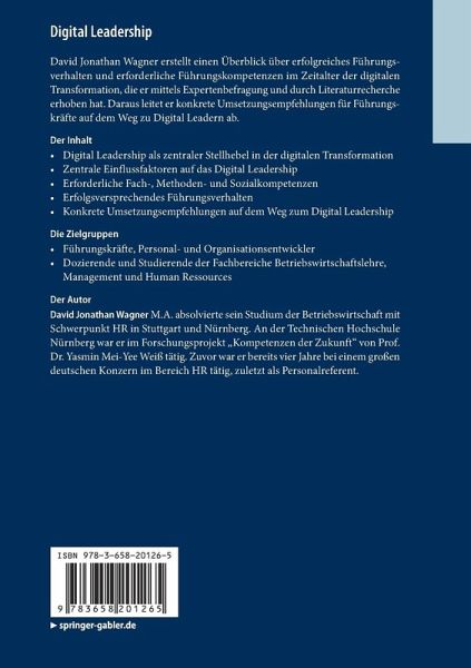 David Jonathan Wagner erstellt einen Überblick über erfolgreiches Führungsverhalten und erforderliche Führungskompetenzen im Zeitalter der digitalen Transformation, die er mittels Expertenbefragung und durch Literaturrecherche erhoben hat. Daraus leitet er konkrete Umsetzungsempfehlungen für Führungskräfte auf dem Weg zu Digital Leadern ab.