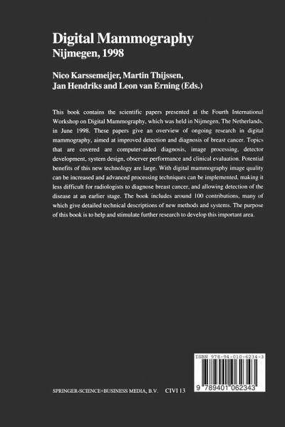 In June 1998 the Fourth International Workshop on Digital Mammography was held in Nijmegen, The Netherlands, where it was hosted by the department of Radiology of the University Hospital Nijmegen. This series of meetings was initiated at the 1993 SPIE Biomedical Image Processing Conference in San Jose, USA, where a number of sessions were entirely devoted to mammographic image analysis. At very successful subsequent workshops held in York, UK (1994) and Chicago, USA (1996), the scope of the conference was broadened, establishing a platform for presentation and discussion of new developments in digital mammog raphy. Topics that are addressed at these meetings are computer-aided diagnosis, image processing, detector development, system design, observer performance and clinical evaluation. The goal is to bring researchers from universities, breast cancer experts, and engineers together, to exchange information and present new scientific developments in this rapidly evolving field. This book contains all the scientific papers and posters presented at the work shop in Nijmegen. Contributions came from as many as 20 different countries and 190 participants attended the meeting. At a technical exhibit companies demon strated new products and work in progress. Abstracts of all papers were reviewed by members of the scientific committee. Many of the accepted papers had excellent quality, but due to limited space not all of them could be included as full papers in these proceedings. Papers that were rated high by the reviewers are included as long or short papers, others appear as extended abstracts in the last chapter.